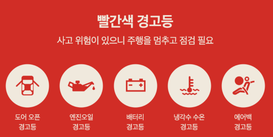 계기판에 빨간색 경고등이 점등되었다면 즉시 주행을 중지하고 점검 및 확인이 필요한 상태입니다.