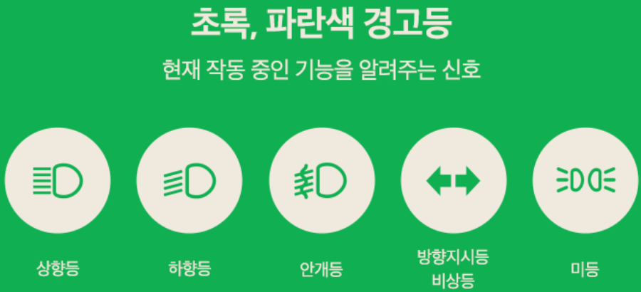 초록색 또는 파란색 기호가 점등되었다면 안심하셔도 됩니다. 상향등이나 하향등, 안개등, 방향지시등처럼 운전 중인 자동차에서 작동하고 있는 기능을 나타내는 표시이기 때문입니다.